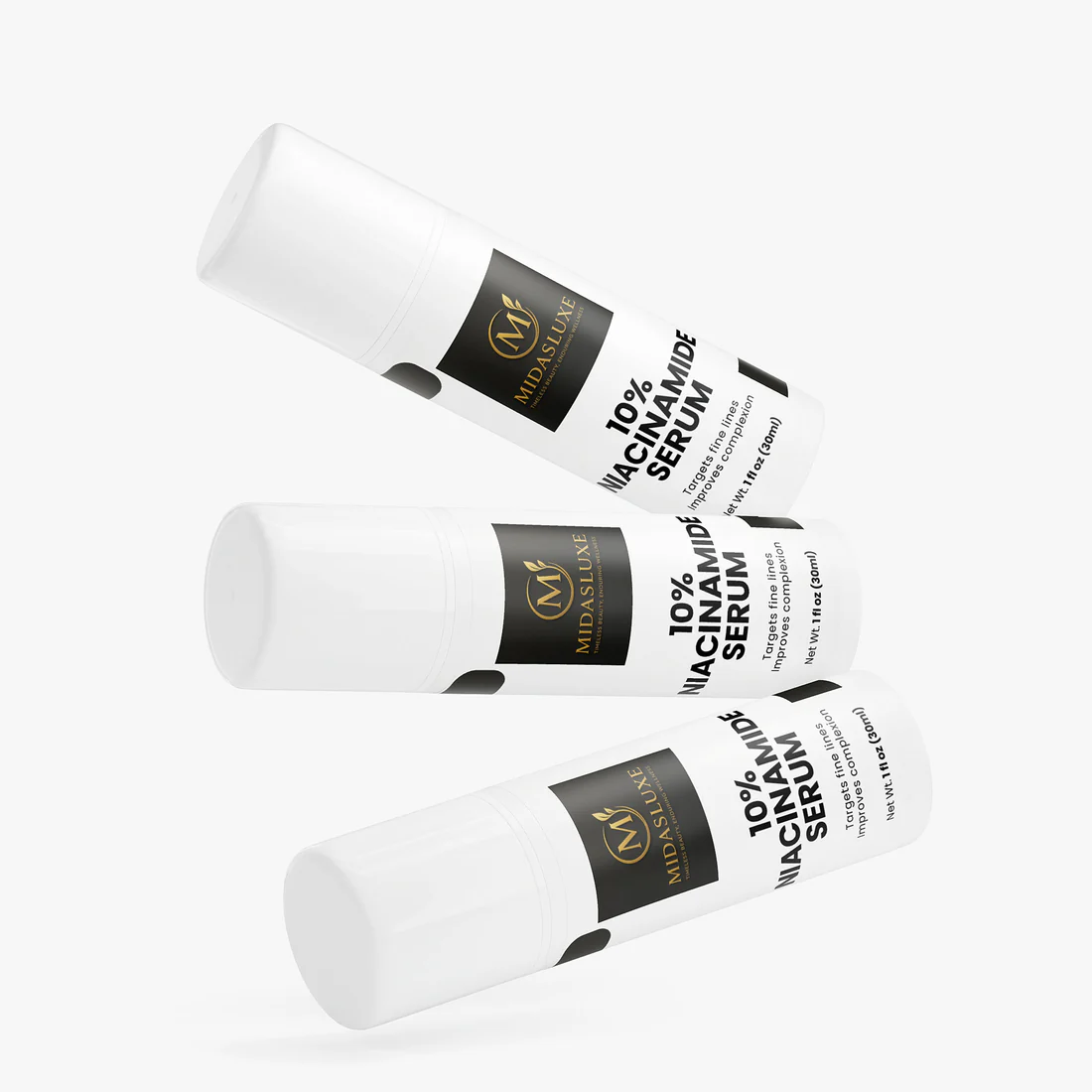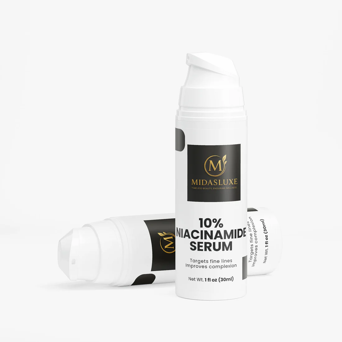 Experience the harmonious synergy of Sodium Hyaluronate and Propanediol, delivering deep hydration and moisture retention, in our concentrated 10% Niacinamide formulation. Indulge in the comforting benefits of Chamomilla Recutita Flower Extract and Allantoin, blending to nurture skin resilience and enhance a tranquil complexion. Tailored to minimize pore visibility and restore skin balance, our serum is a comprehensive solution for radiant, even-toned skin. Embrace the power of targeted skincare with our 10% Niacinamide Serum, an essential addition to your daily routine for a visibly healthier and more vibrant complexion.